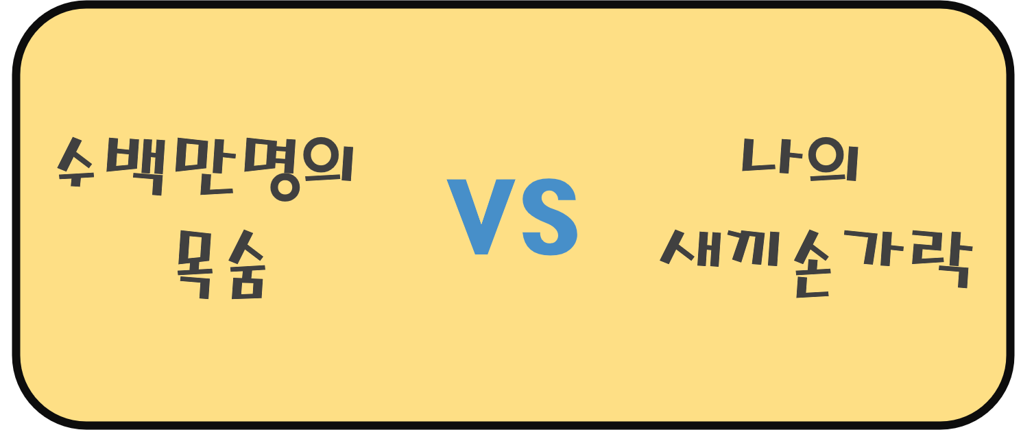 코로나로 인해 수백만 명이 갑자기 사망했다고 기사가 났다고 가정해 보시죠. 너무 슬픈 일입니다. 하지만 우리는 걱정은 오래가지 않습니다. 저녁으로 무엇을 먹을지 고 민하고, 밤이 되면 '너무 끔찍한 상황이야'라고 말하고 잠에 곯아떨어질 것입니다. 하지만 다른 상황을 상상해 볼까요? 건강검진을 받았습니다. 손가락에 종양이 있어 내일 손가락 하나를 잘라야 한답니다. 그날 밤, 잠자리의 당신은 불안한 마음에 잠에 들지 못하겠죠. 이렇듯 인간은 수많은 사람들의 사망 사건보다 자신의 작은 불운에 더 고통스러워합니다.