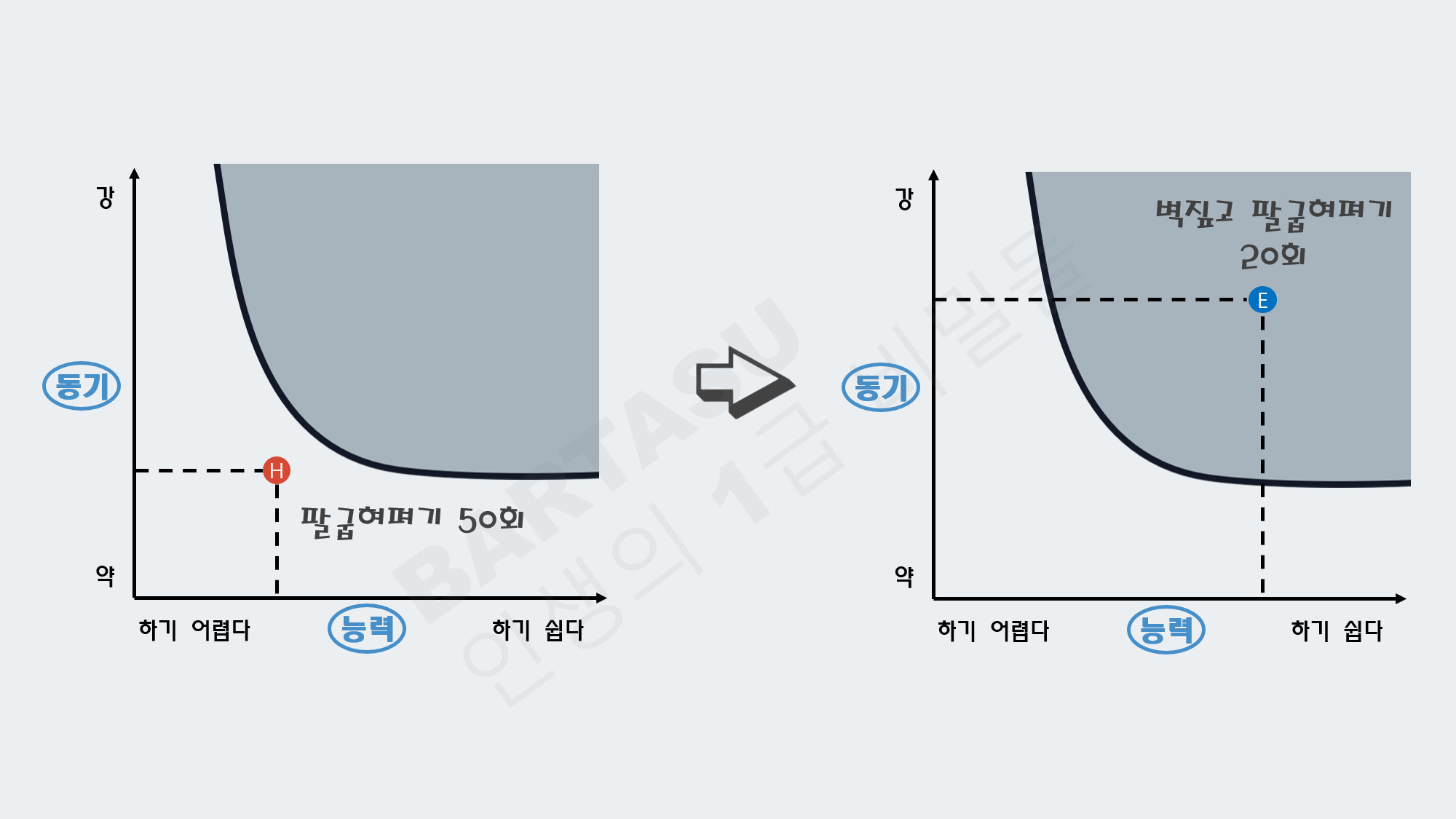 포그행동모형은 어떤 행동에 대해서 능력과 동기에 따라 분석하는 것입니다. 아래 그래프를 보시면, 능력 x축과 동기 y축 그래프 안에 포물선을 그리는 행동 곡선이 있습니다. 무조건! 이 행동곡선 안쪽에 있는 행동만이 습관이 형성될 수 있습니다. 아래처럼 내가 '팔 굽혀 펴기 50회 하기'를 습관을 만들려 합니다. 그런데, 나는 팔 굽혀 펴기 5개도 못하네요. 능력도 안될 뿐더러, 동기도 적어집니다. 이와 같은 경우가 아래 왼쪽 그래프 입니다. 행동 곡선안에 있지 않습니다. 자, 이제 더 쉽게 쪼개서 '벽짚고 팔굽혀펴기 20회'로 바꿔보시죠. 당장이라도 할 수 있을것 같습니다. 포그행동모형은 오른쪽과 같이 되겠죠. 행동곡선 내에 있습니다. 이렇게 내가 만들고 싶은 습관을 쉽게 쪼개서 행동곡선 위에 자리 잡는 게 핵심!입니다.