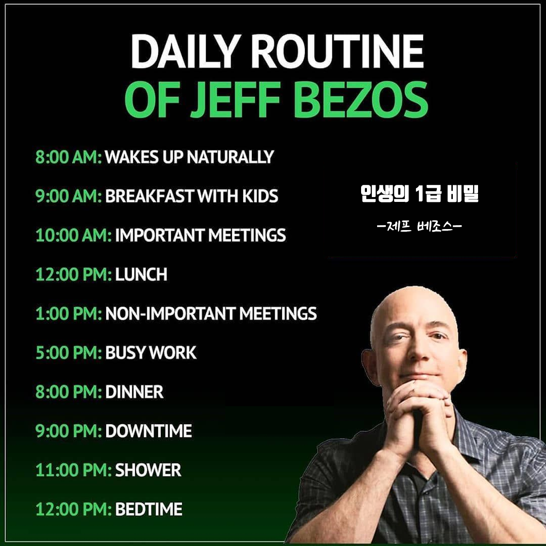 제프 베조스에게 가장 중요한 시간은 수면시간입니다. 그는 매일 8시간을 수면하고 알람 시계의 도움없이 일어납니다. 그는 아침에 커피를 마시며 신문을 읽고, 가족과 함께 식사를 합니다. 제프 베조스는 충분한 수면과 여유로운 아침시간은 자신에게 매우 중요하다고 말 합니다. 그 시간 통해 충분히 휴식하고 재충전하면, 회사에서 최고의 컨디션으로 최선의 선택들을 할 수 있다고 말합니다. "매일 규칙적으로 8시간을 휴식하면 더 좋은 생각을 할 수 있고, 더 많은 에너지를 충전하고, 더 좋은 기분을 유지 할 수 있습니다." 또한 그는 수면시간은 규칙적이야 한다고 강조합니다. "같은 시간에 잠들고, 같은 시간에 일어나야 좋은 컨디션을 유지 할 수 있습니다. 계속해서 선순환이 되어야 합니다. 불규칙한 수면은 제대로된 순환고리를 만들지 못합니다." 베조스는 4시간을 자고 하루 130번의 선택들을 하는 것보다 8시간을 자고 하루에 3번의 선택을 하는 것이, 훨씬 중요하며, 아마존은 그런 방식으로 탄생했다고 설명합니다.